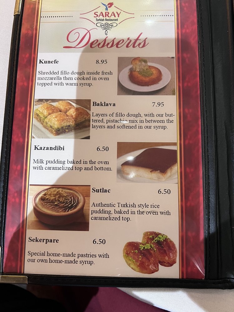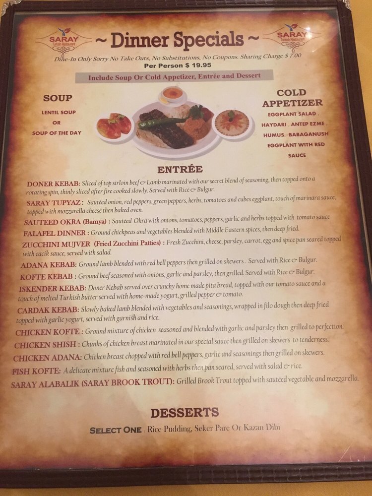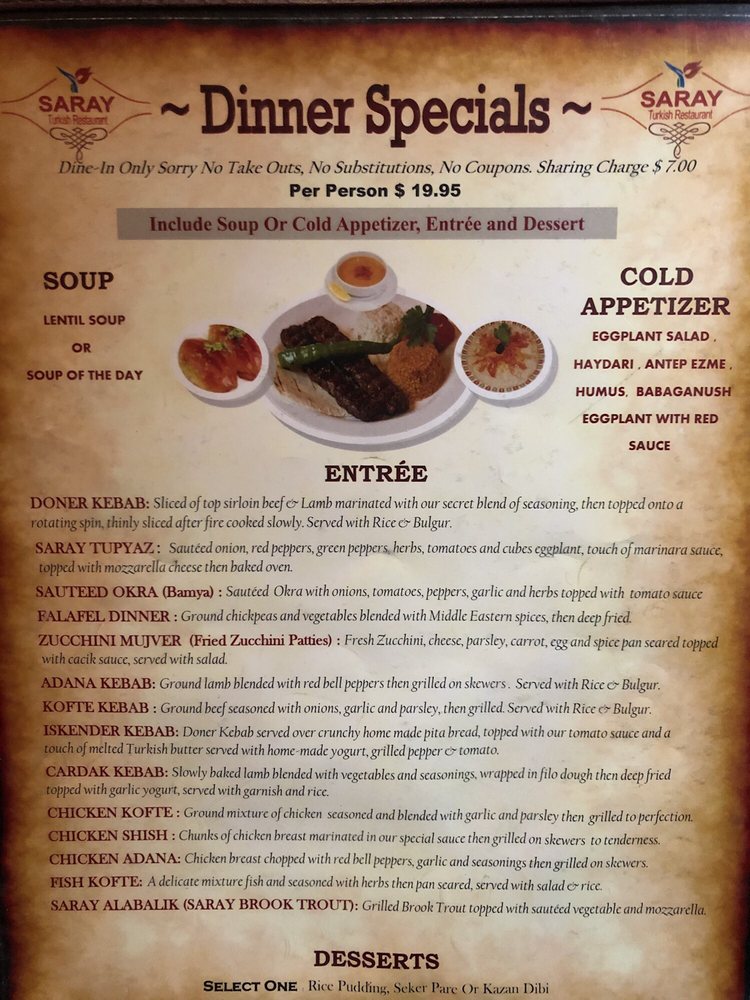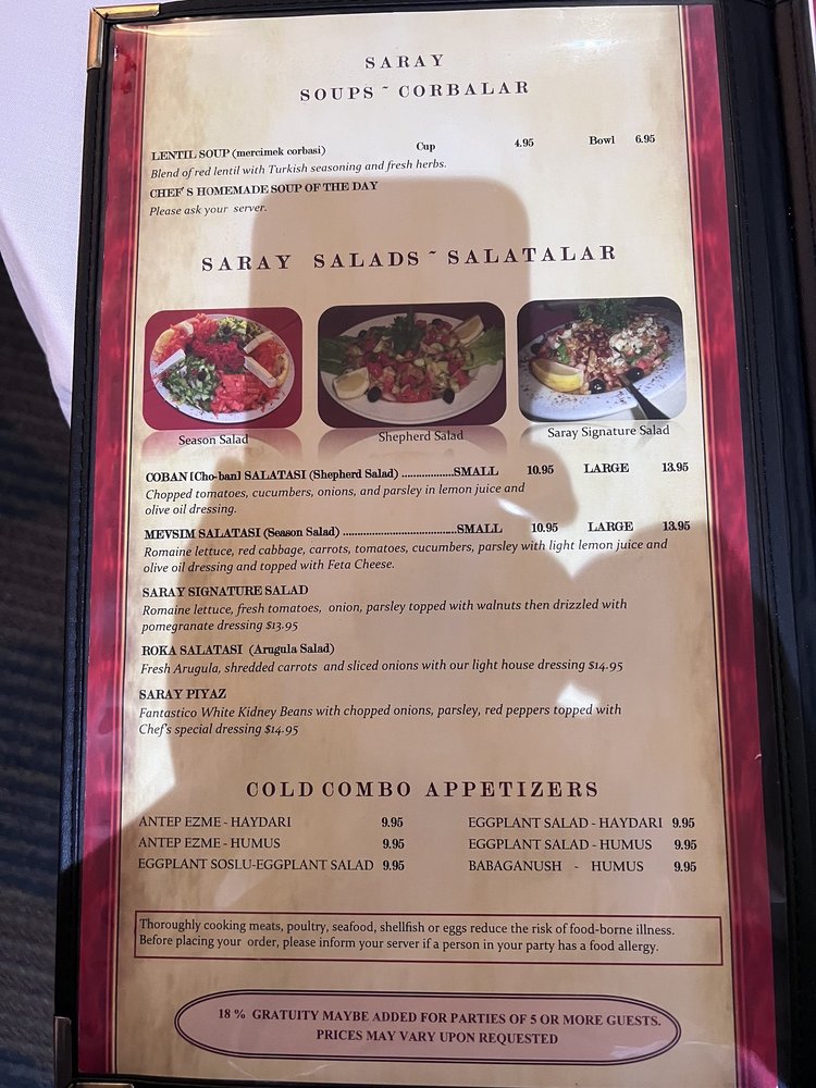 Saray Turkish Restaurant, located in West Haven, CT, offers a delightful Turkish dining experience with a variety of traditional dishes. The menu boasts flavorful Saray Soups, refreshing Saray Salads, and a tempting selection of Cold Combo Appetizers. Customers rave about the welcoming atmosphere and attentive service, with reviews praising the delicious and healthy food offerings. Highlights include the Shepherd Salad, Roka Salatasi, and the Eggplant Soslu Appetizer. The restaurant's Istanbul-inspired decor adds to the charm of the dining experience. With BYOB options, free parking, and a clean environment, Saray Turkish Restaurant is a must-visit for those craving authentic Turkish cuisine in a cozy setting.