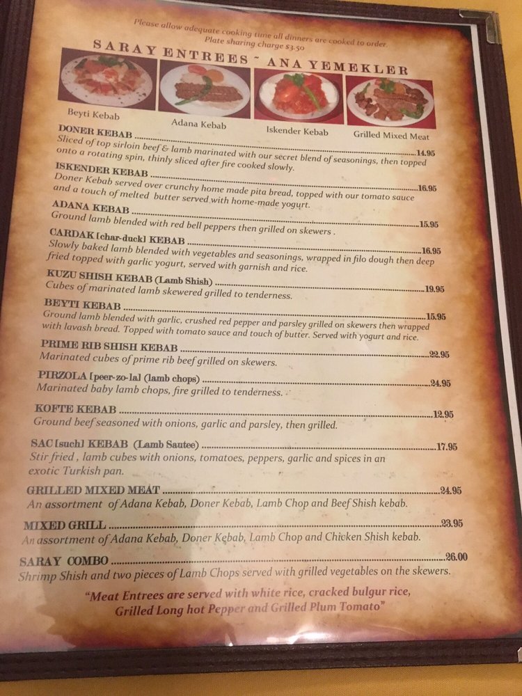 Saray brook trout. Grilled boneless marinated brook trout topped with sauteed mushrooms, onions, peppers, tomatoes, spices, and Turkish kosher cheese. Served with rice.